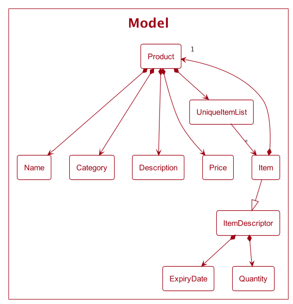 Commands are separated into different packages depending on their functionalities. Thus, the commands package includes the item package for item commands and the product package for product commands. The rest of the commands that do not fit into those two are directly under the command package.