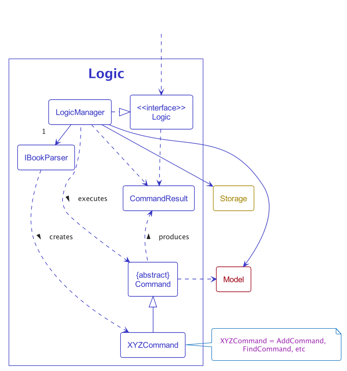 Commandobject (more precisely, an object of one of its subclasses e.g.,AddCommand) which is executed by theLogicManager. - The command can communicate with the